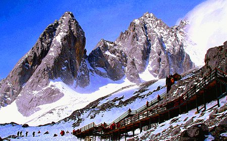 早乘车前往【玉龙雪山景区】:全山13峰,峰峰终年披云戴雪,似一排玉柱立地擎天,如一条矫健的玉龙,并肩耸立在金沙江东岸。(可自费)乘雪山索道观赏终年积雪不化的玉龙雪山观赏离赤道最近的冰川、深切感受自然的雄奇威严;【漫步高原牧场—甘海子】及有“仙人遗田”美称的【白水河】。下午乘车返回大理,大理晚乘旅游专列火车卧铺至昆明。